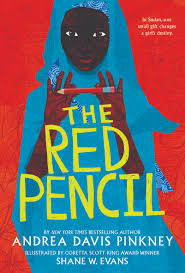 I was drawn into the life of a young girl in Sudan while reading The Red Pencil by Andrea Davis Pinkney. Amira lives in Sudan and it is her twelfth birthday. She is thrilled with her gifts: a song sung to her by her younger sister, and a sharpened stick given to her by her father. With the stick she is able to draw pictures in the sand. She dreams of learning to read and write and wants desperately to go to school. Although her father is open to her attending school, her mother tells her that her destiny is to be married, have children, and keep house. One night Amira’s village is attacked by the Janjaweed, a group of men that ravage the village and kill many people. Amira, her mother and her sister travel to a refugee camp with some of the surviving villagers. There Amira learns to heal from the horrors she has witnessed while secretly learning to read, keeping alive her dream of attending school.